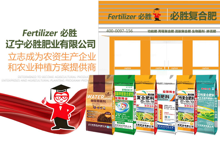 辽宁必胜肥业有限公司成立于1998年。公司董事长李英先生在东北地区拥有两家化肥生产基地,黑龙江沃丰肥业和营口晟枭科技发展有限公司。主营高塔复合肥、碳能型脲甲醛缓释肥、稳定性螯合肥、锌腐酸型 螯合肥、海藻酸钾型螯合肥、氨基酸型螯合肥,同时也是生产缓控释肥与新型螯合肥的生产基地,产品远销于辽宁、吉林、黑龙江、河北、内蒙古、山东等地,用户遍布大江南北。